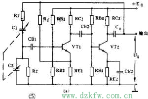 图5(a)是一种常见的RC桥式振荡电路。图中左侧的R1C1和R2C2串并联电路就是它的选频网络。这个选频网络又是正反馈电路的一部分。这个选频网络对某个特定频率为f0的信号电压没有相移(相移为0°),其它频率的电压都有大小不等的相移。由于放大器有2级,从V2输出端取出的反馈电压Uf是和放大器输入电压同相的(2级相移360°=0°)。因此反馈电压经选频网络送回到VT1的输入端时,只有某个特定频率为f0的电压才能满足相位平衡条件而起振。可见RC串并联电路同时起到了选频和正反馈的作用。