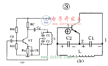 还有一种常用的振荡电路是电容三点式振荡电路,见图3(a)。图中电感L和电容C1、C2组成起选频作用的谐振电路,从电容C2上取出反馈电压加到晶体管VT的基极。从图3(b)看到,晶体管的输入电压和反馈电压同相,满足相位平衡条件,因此电路能起振。由于电路中晶体管的3个极分别接在电容C1、C2的3个点上,因此被称为电容三点式振荡电路。