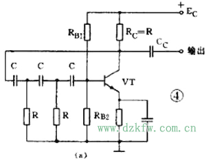 图4(a)是RC相移振荡电路。电路中的3节RC网络同时起到选频和正反馈的作用。从图4(b)的交流等效电路看到:因为是单级共发射极放大电路,晶体管VT的输出电压Uo与输出电压Ui在相位上是相差180°。当输出电压经过RC网络后,变成反馈电压Uf又送到输入端时,由于RC网络只对某个特定频率f0的电压产生180°的相移,所以只有频率为f0的信号电压才是正反馈而使电路起振。可见RC网络既是选频网络,又是正反馈电路的一部分。