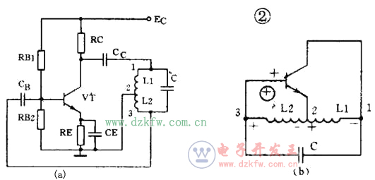 图2(a)是另一种常用的电感三点式振荡电路。图中电感L1、L2和电容C组成起选频作用的谐振电路。从L2上取出反馈电压加到晶体管VT的基极。从图2(b)看到,晶体管的输入电压和反馈电压是同相的,满足相位平衡条件的,因此电路能起振。由于晶体管的3个极是分别接在电感的3个点上的,因此被称为电感三点式振荡电路。