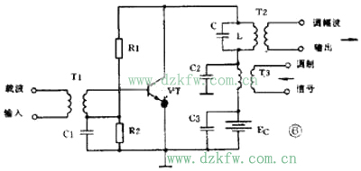 图6是集电极调幅电路,由高频载波振荡器产生的等幅载波经T1加到晶体管基极。低频调制信号则通过T3耦合到集电极中。C1、C2、C3是高频旁路电容,R1、R2是偏置电阻。集电极的LC并联回路谐振在载波频率上。如果把三极管的静态工作点选在特性曲线的弯曲部分,三极管就是一个非线性器件。因为晶体管的集电极电流是随着调制电压变化的,所以集电极中的2个信号就因非线性作用而实现了调幅。由于LC谐振回路是调谐在载波的基频上,因此在T2的次级就可得到调幅波输出。