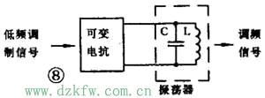 能够完成调频功能的电路就叫调频器或调频电路。常用的调频方法是直接调频法,也就是用调制信号直接改变载波振荡器频率的方法。图8画出了它的大意,图中用一个可变电抗元件并联在谐振回路上。用低频调制信号控制可变电抗元件参数的变化,使载波振荡器的频率发生变化。