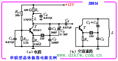 串联型晶体振荡电路如图Z0816(a)所示,图(b)为它的交流等效电路,由图(b)可知,该电路与电容三点式振荡电路十分相似。不同的只是反馈信号不是直接接到晶体管的输入端, 而是经过石英晶体接到晶体管的发射极与基极之间,从而实现正反馈。当调谐振荡回路,使其振荡频率等于石英晶体谐振器的串联谐振频率fS时晶体的阻抗最小,且为纯电阻,这时正反馈最强,相移为零,故满足自激振荡条件。对于fS以外的其它频率,晶体的阻抗增大,相移也不为零,不满足自激振荡条件,因此振荡频率等于晶体的串联谐振频率fS。由于晶体的固有频率与温度有关,所以在特定的场合下,将采用温度补偿电路或将石英晶体置于恒温槽中,以达到更高频率稳定度的要求。