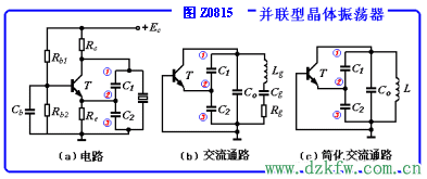 并联型晶体振荡电路如图Z0815所示。振荡回路由C1、C2和晶体组成。由图可知,电路满足"射同基反"的原则,从而构成电容三点式振荡电路。显然,晶体在回路中起着电感的作用,亦即晶体必然工作在fSfp之间。