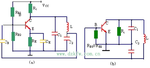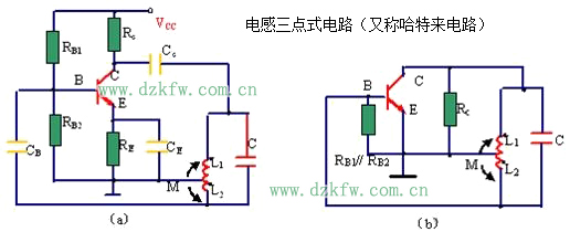 图2 电感三点式振荡电路 图2 是一种电感三点式振荡电路(又称哈特来电路),(a)为原理电路,(b)为交流通路。