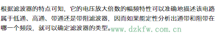 识别滤波器的方法是:若信号频率趋于零时有确定的电压放大倍数,且信号频率趋于无穷大时电压放大倍数趋于零,则为低通滤波器;反之,若信号频率趋于无穷大时有确定的电压放大倍数,且信号频率趋于零时电压放大倍数趋于零,则为高通滤波器;若信号频率趋于零和无穷大时电压放大倍数均趋于零,则为带通滤波器;反之,若信号频率趋于零和无穷大时电压放大倍数具有相同的确定值,且在某一频率范围内电压放大倍数趋于零,则为带阻滤波器。