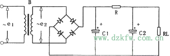 首先从结构上来讲,这种滤波电路是由两个电容器和一个电阻器组成,它实际上就是L形滤波电路中电阻器前面再加个电容器接地就成了π形RC滤波电路。两个电容同时进行滤波作用,后面一个滤波电容可以把前面电容未滤完整的直流电压进一步滤波,这样两个电容同时进行滤波,滤波效果当然是更加理想。可以加大第一只滤波电容的容量来提高滤波效果,但第一只滤波电容的容量不能太大,因为刚开机接通电源时,第一只滤波电容容量太大的话充电时间会太长,这一充电电流是流过整流二极管的,当充电电流太大、持续时间太长时,会损坏整流二极管,所以采用这种π形RC滤波电路时,可以使第一只电容容量略有减少,通过调整后面的L形RC滤波电路来提高滤波效果。