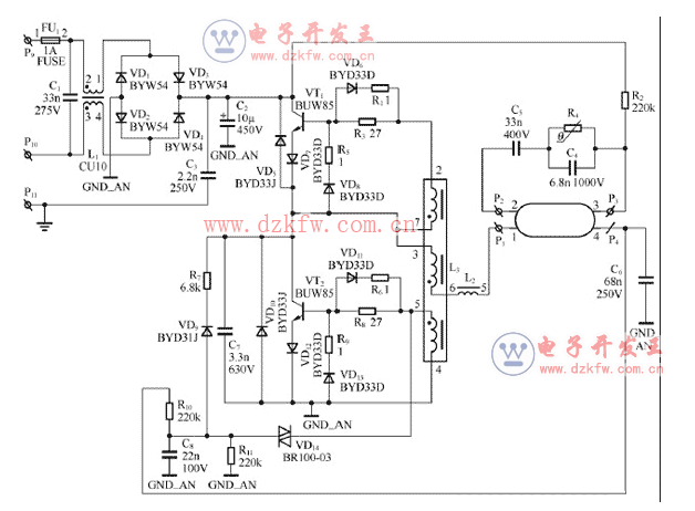 下图中Q1、R1、D1、D2组成恒流供电稳压源,通过D11、D21、D31为3路多谐振荡器提供电源。多谐振荡器由6个反向器及电阻电容组成,6反向器分4级,其4级顺序串联,而前3级组成振荡器。