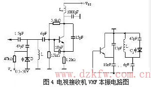 某彩色电视接收机VHF调谐器中第6-12频段的本振电路如图所示电路中,控制电压VC为0.5-30V,改变这个电压,就使变容管的结电容发生变化,从而获得频率的变化。由图4可见,这是一典型的西勒振荡电路,振荡管呈共集电极组态,振荡频率约为170-220MHz,这种通过改变直流电压来实现频率调节的方法,通常称为电调谐,与机械调谐相比它有很大的优越性。