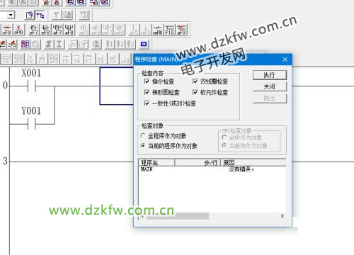 第三步:系统会自动的检查是否有错误。这里只检查梯形图的绘制错误。确认没有问题。