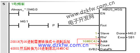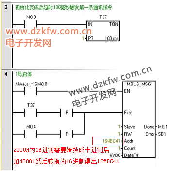第三步:用初始化完成位M0.0延时100ms触发第一条通讯指令,内容为:将vw0的值写入1号站的地址为2000H寄存器(2000H为16进制需要转换成十进制后加40001然后转换为16进制得出16#BC41)。