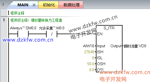 2.首先调用模拟量转换指令将采集到的模拟量通道值转换为实际工程值,假设工程值的上下限分别为0.0、50.0,如图1所示: