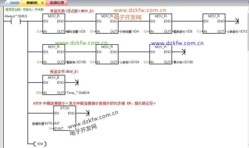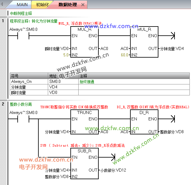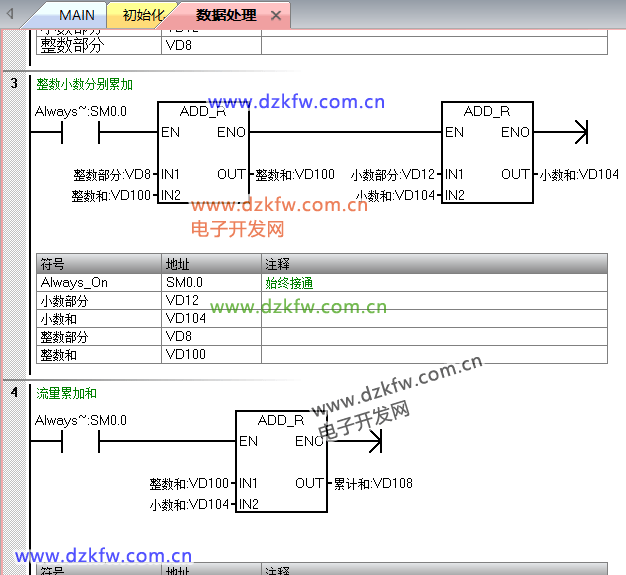 该梯形图程序采用将浮点数分离为整数和小数两部分,各自求和后再分别相加,得出当前流量累积值,大大减小了累积误差,适用于要求精度不是很高的场合。