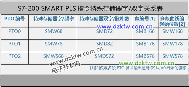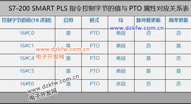 下面这张表列出了控制字节的值(16进制)与PTO的频率、脉冲数、单段/多段的对应关系: