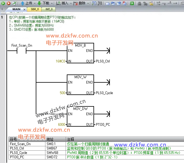 举个例子:如果要设置PTO0的单段输出频率为500Hz,输出6000个脉冲数,则设置:SMW68=500,SMD72=6000;