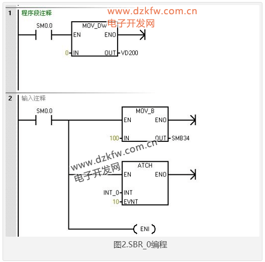 本例使用定时中断实现对100ms定时周期计数。我们使用特殊存储器定时中断0。由定时中断0的中断事件号为10,确定周期的特殊寄存器字节时SMB34。