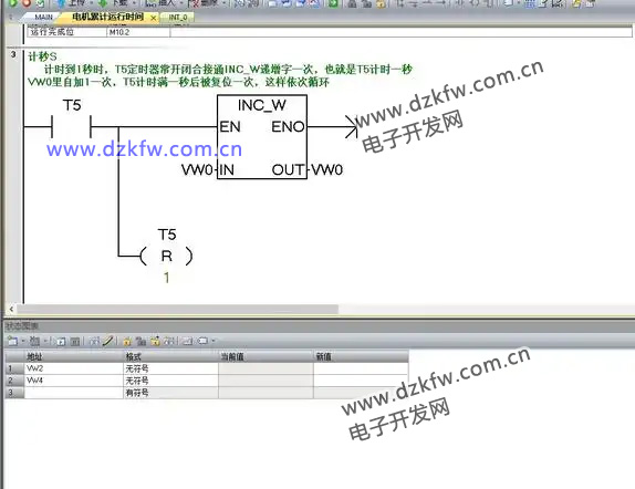 计时到1秒时,T5定时器常开闭合接通INC_W递增字一次,也就是T5计时一秒VW0里自加1一次,T5计时满一秒后被复位一次,这样依次循环;