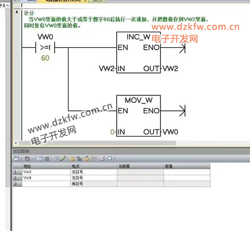 当VW2里面的值大于或等于数字60后执行一次递加,并把数值存到VW4里面,同时复位VW4里面的值