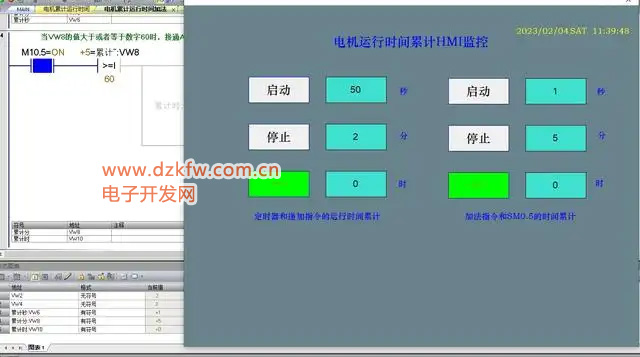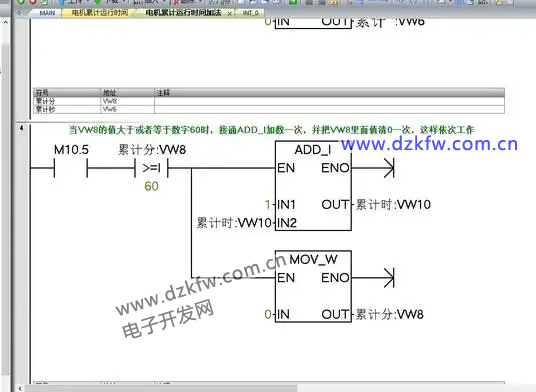 当按下M10.3时,M10.5线圈得电,辅助触点闭合自锁,同时接通Q0.0电机输出。当SM0.5以0.5秒接通0.5秒断开的脉冲累计加,结果存到VW6里面;