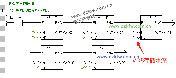 例:已知圆柱形水桶的半径r=30cm,水深是用VD8存储,求水的质量(kg)