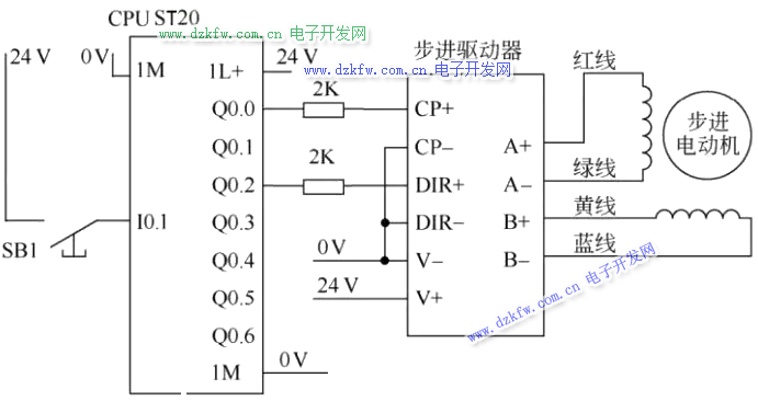 注意:由于PLC的输出信号电压与步进电机驱动器的接受信号电压不一致,故不能直联接,可以采取串2K左右的电阻来进行分压,具体还是看图吧。(为什么是2K左右:一般驱动器输入为光电耦合器,即负载是一个LED负载,而LED正常工作电流一般为5~8mA左右,那么在24V电压下,5~8mA = 24 / 电阻 ,电阻 = 24 /0.008 = 3K,考虑到步进驱动器输入不仅仅是直接的LED,还需要有一个限流电阻器,所以取值2K左右的电阻器限流是允许的。)