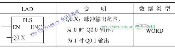 在PLC的指定输出点(Q0.0~Q0.1,Q0.3)上实现脉冲输出(PTO)和脉宽调制(PWM)功能。CPU ST20具备配有两个PTO/PWM发生器,它们可以产生一个高速脉冲串或者一个脉冲调制波形。当Q0.0和 Q0.1作为高速输出点时,其普通输出点被禁用,而当不作为PTO/PWM发生器时,Q0.0和 Q0.1可作为普通输出点使用。一般情况下,PTO/PWM输出负载至少为10%的额定负载。脉冲输出指令(PLS)配合特殊存储器用于配置高速输出功能,PLS指令格式见下表。