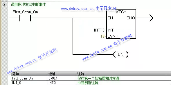 ②PTO状态字中的空闲位(SM66.7或者SM76.7)标志着脉冲输出完成。另外,在脉冲串输出完成时,可以执行一段中断服务程序。如果使用多段操作时,可以在整个包络表完成后执行中断服务程序。