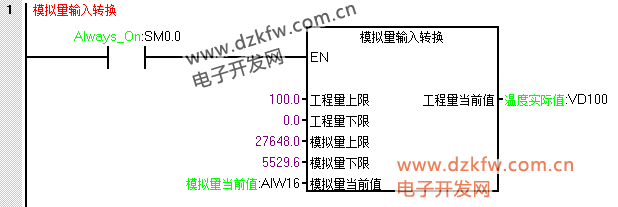 硬件配置:ST20 CPU 、模拟量扩展模块EM AM03、温度变送器(输出信号4-20ma,量程0℃-100℃)、PT100。