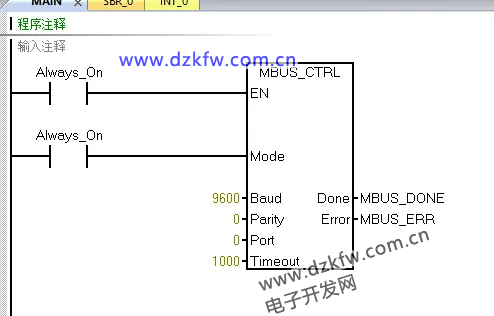 “模式”(Mode) 输入的值用于选择通信协议。输入值为 1 时,将 CPU 端口分配给 Modbus 协议并启用该协议。输入值为 0 时,将 CPU 端口分配给 PPI 系统协议并禁用 Modbus 协议。