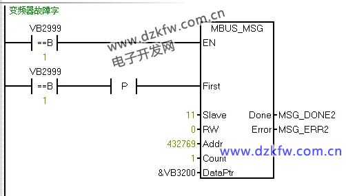 Slave=11代表从站设备的通讯ID为11;RW=0代表只读;Addr=432769代表从站设备的modbus寄存器地址;count=1代表一个字。DataPtr(间接地址指针)=&VB3200代表从VB3200开始。一个字就是VW3200。