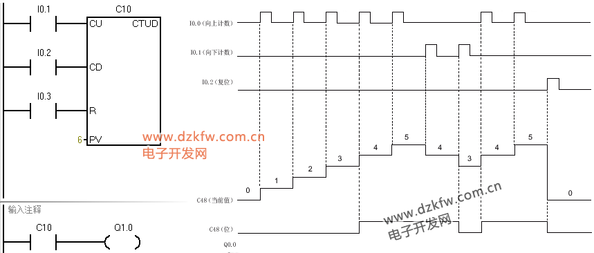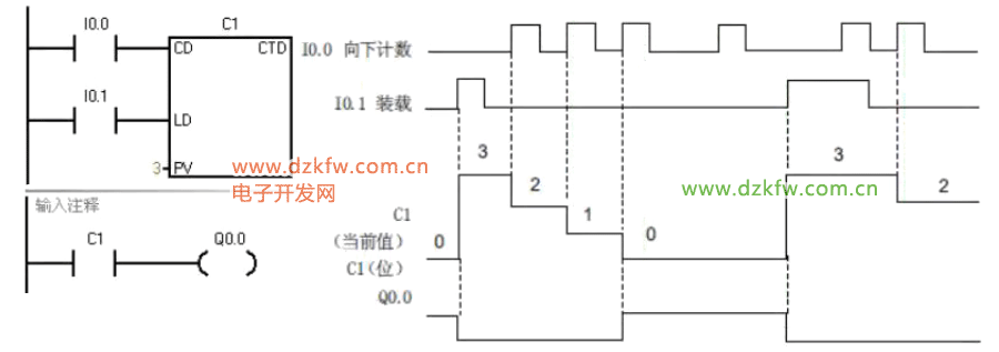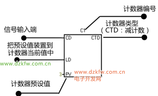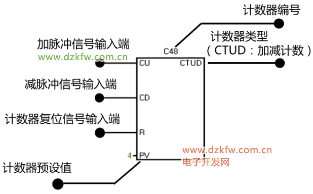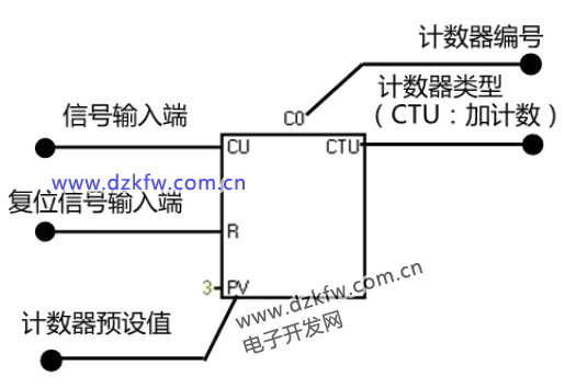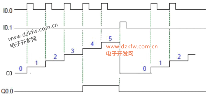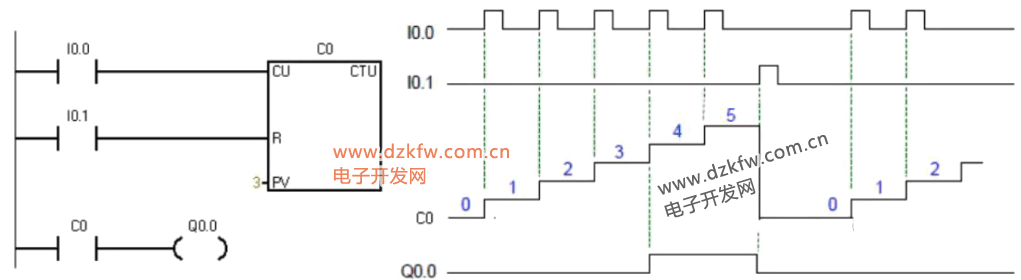 CU为脉冲信号输入管脚,R为计数器复位管脚,当CU端产生一个脉冲信号时,计数器C0的当前值递增1,当当前值大于或等于PV值时,计数器的触点发生变化,当复位端信号为1 时,计数器的当前值会变为0减计数数序图