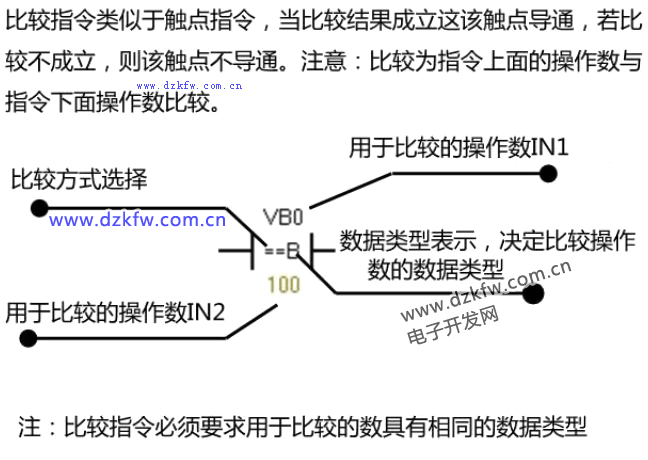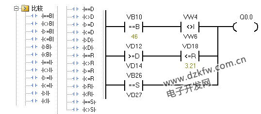 加减计数集成了加计数和减计数的功能,当CU端信号由0变为1 时,计数当前值加1 ,当CD端信号由0变为1 时,计数当前值减1 ,当计数器的当前值大于或等于PV值时,计数器的触点发生变化;当复位端R为1 时,计数器的当前值会被清零常用功能指令(1)比较指令比较指令可分为以下几种:字节比较指令、整数比较指令、双整数比较指令、实数比较指令、字符串比较指令按照比较结果可分为=、≠、>、<、≥、≤指令格式