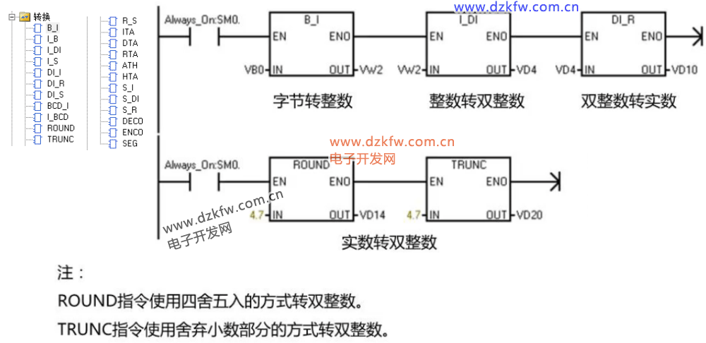 (4)整数运算指令整数运算指令又称为数学(四则)运算指令,在实际应用使用比较广泛,如模拟量转换计算,脉冲长度计算等。四则运算指令除了加、减、乘、除以外还有递增指令和递减指令。根据数据类型的不一样每个指令又分为对整数、双整数、实数的运算;以及三角函数指令