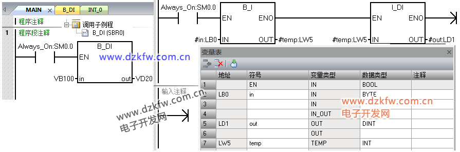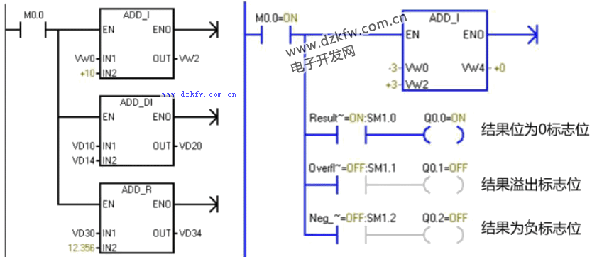 加法指令主要针对两个数据相加的结果放在OUT端,其IN端可以是常数也能用寄存器来表示;同时在使用的过程中也会用到一些特殊的存储器,如SM1.0 、SM1.1、SM1.2 这些特殊存储器ON的时间取决于运算指令执行的时间长短