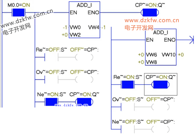 SM1.0 在两个数相加后的结果为0时会为ON SM1.1 在两个数相加后的结果超过此指令指定数据类型的最大范围时会为ON SM1.2 在两个数相加后的结果为负数时会为ON 当多条指令参与运算时,需要判断具体哪条指令是否有产生溢出或为0 及为负数时,应在每条指令下方添加特殊寄存器;如下图所示