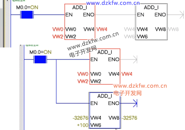 在实际的运算中,如果前面运算的结果要参与后面的运算时,应采用“与”的方式编写而不能用“或”的方式;如下图所示,当运算结果超出指令指定数据类型的最大范围时,最后的运算结果会存储出错前的数值