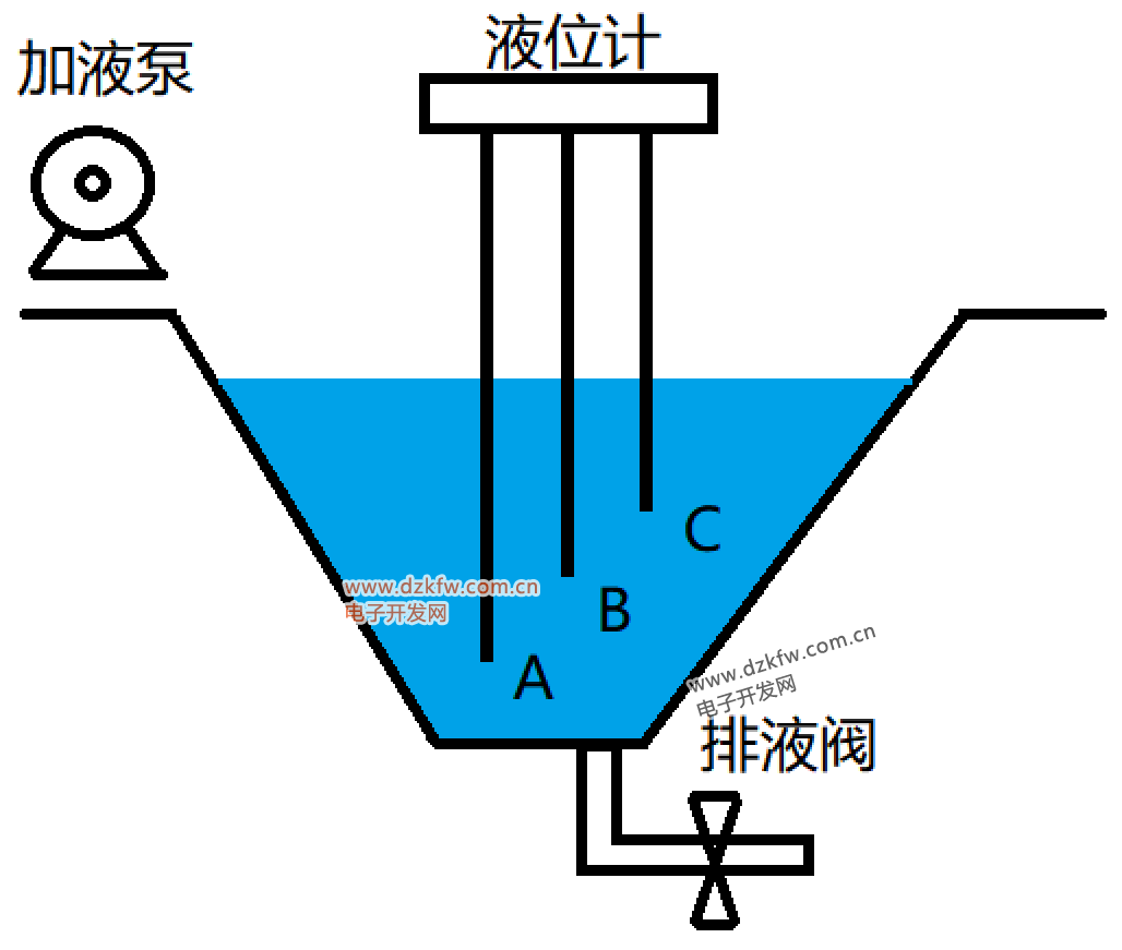 汽车涂装前处理生产线中的磷化槽示意图如图所示,汽车车身挂在输送链上,经过磷化槽时会被涂上一层磷化膜。要求磷化液要保持一定的液位深度,而这个液位是由液位计来进行检测,分为高液位A、低液位B和极低液位C,液位的控制是通过加液泵和排液阀来进行实现的。