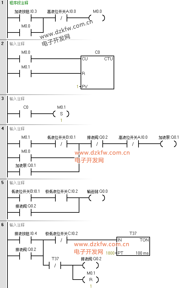 当按下I0.3按钮时,M0.0得电并自保持,同时计数器计数值加1,等于设定值时C0触点接通,并置位M0.1,这是工作周期的开始,开始时液化槽中是空的,三个液位传感器开关都没有信号输入,I0.0、I0.1常闭是接通的,因为M0.1接通,此时Q0.1得电并自锁,加液泵启动,开始往磷化槽加液。开始时由于液位较浅,输送链是不启动的,随着液位的增加,到达低液位,B液位传感器信号I0.1接通,I0.0也是接通的,所有Q0.0输出,启动输送链。当液位到达高液位时,A液位传感器信号I0.0接通,程序段4中的I0.0常闭点断开,Q0.1失电,加液泵停止工作。