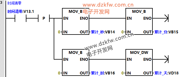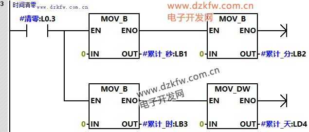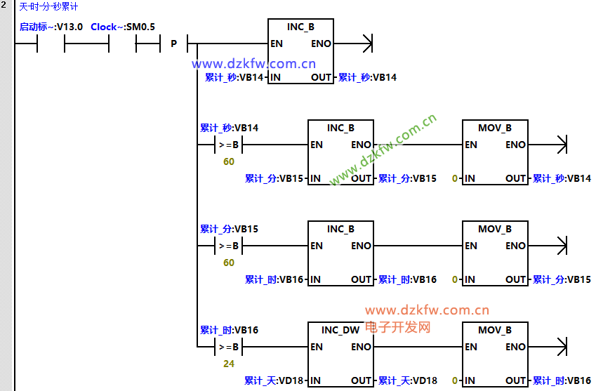 (2)程序段2是当启动标志位接通之后,利用系统时钟1HZ脉冲接通“秒”累计,当到达60秒后“分钟”地址加1,同时“秒钟”清零;当到达60分钟后小时地址加1,同时“分钟”清零;当到达24小时后“天”地址加1,同时“小时”清零。
