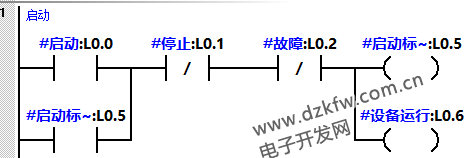 (1)程序段1启停控制:V10.0接通后Q1.5接通,按下停止按钮或者发生故障时设备停止。