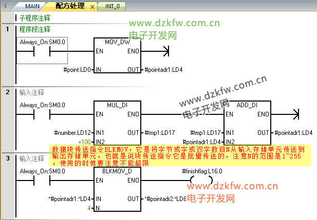 总结:巧妙地利用200SMART的间接寻址功能,可大大简化程序的编写工作量,即使配方数再多、配方数据再长,只要不超过PLC的存储容量和扫描周期的长度,均可用这个案例程序来处理。另外配方子程序的最后那段采用批量传送指令也很巧妙,不必使用FOR循环指令传送,也简化了程序编写。