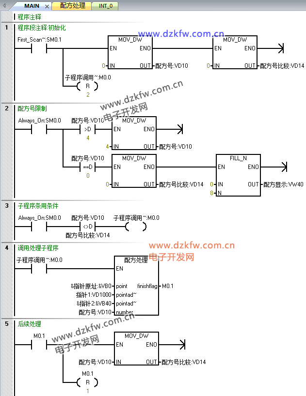 主程序编写相对简单,主要是在程序运行初期初始化一些变量、限定配方号数值、根据配方的选择激活调用配方处理子程序的位变量M0.0以及子程序执行完以后复位相关变量。如下图4所示: