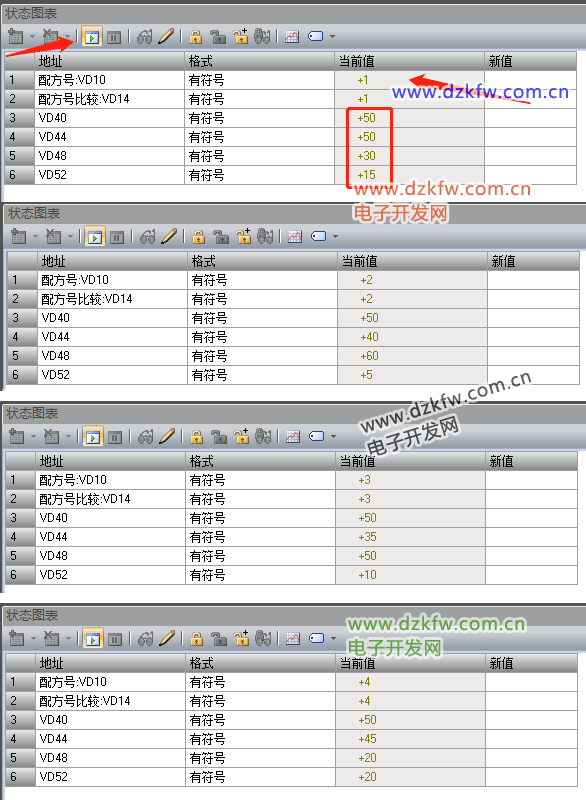 将程序下载到PLC中,选择在线监控,在状态图表中输入需监控的变量地址,将不同的配方编号写入VD0中,大家和图1的配方数据比较,可以发现数据是完全一致的。监控视图如下图5所示: