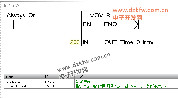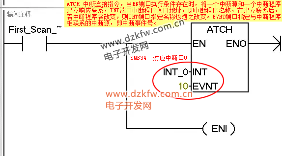 主程序中设计一个附加中断程序段。INT管脚是引用的中断子程序。EVNT为中断事件编号(本次10代表定时中断 0(SMB34 控制时间间隔))。ENI代表启用中断。