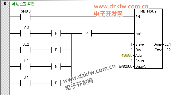 该示例是PLC通过modbus去读取马达的位置。读取控制器地址9000这个寄存器里面的数据
