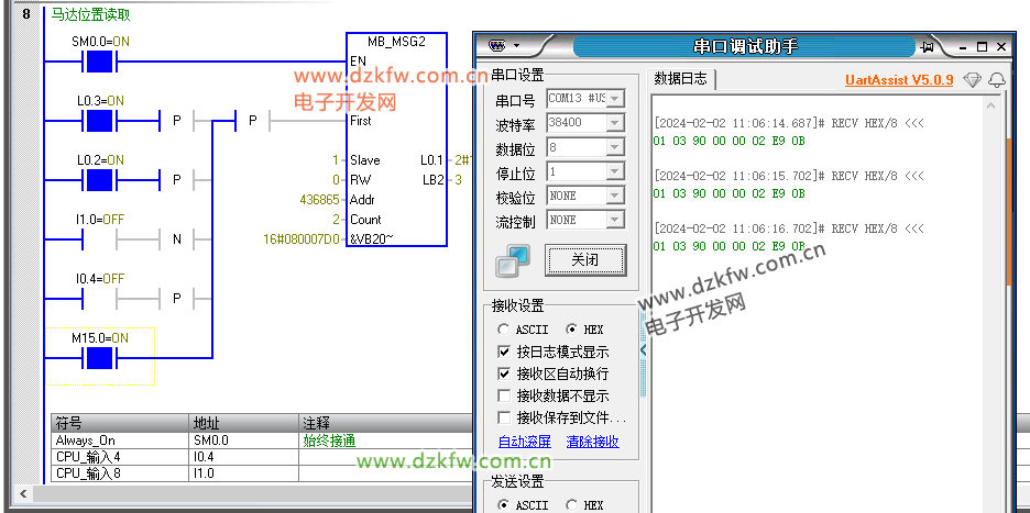 通过串口调试助手来测试一下:接通M15.0发送信号,串口调试助手收到了PLC发送的信号。且可以看到收到的数据与IAI操作手册示例一致。测试成功