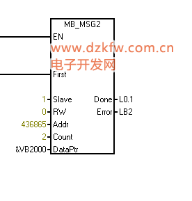 通过MB_MSG,向1号从站读取从36865(Addr)这个地址开始2位(Count)的数据,并把读取到的数据写入VB2000