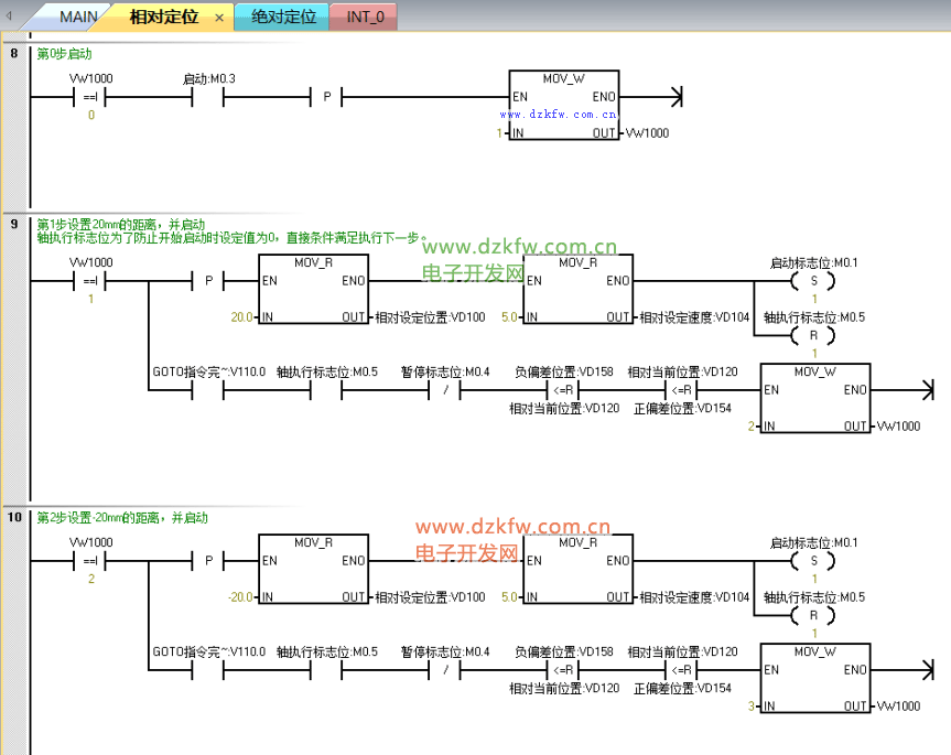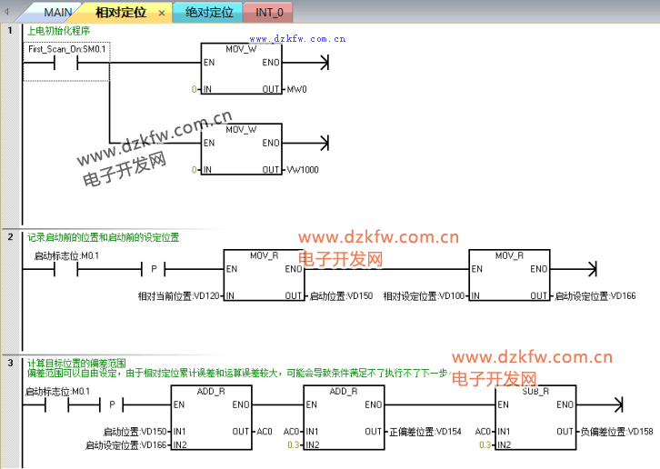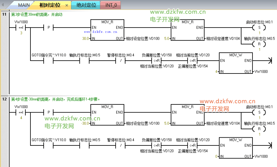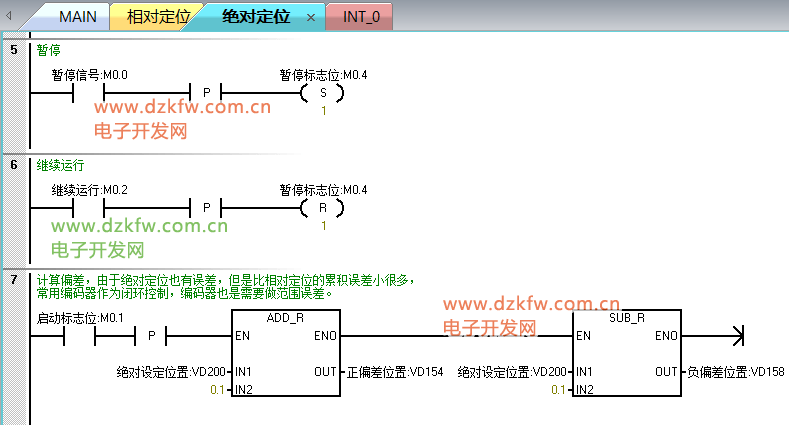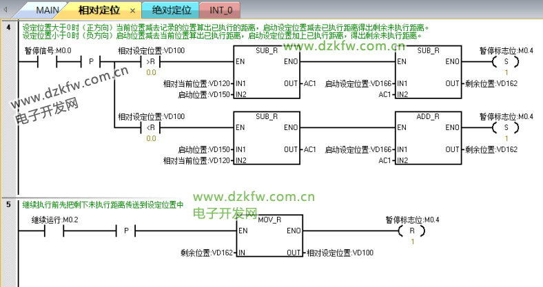 相对定位的需要记录运行前的位置,暂停后把当前位置和运行前的位置进行运算,继续运行时把剩余距离赋值到GOTO指令中的设定位置,具体程序如图3—图7所示,程序有注释讲解,这里不做过多的介绍,有问题可以在评论留言。