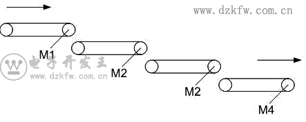 (2)停止时,先停最前面一条皮带,每延时5s后,依次停止其它皮带机,即M1→M2→M3→M4。