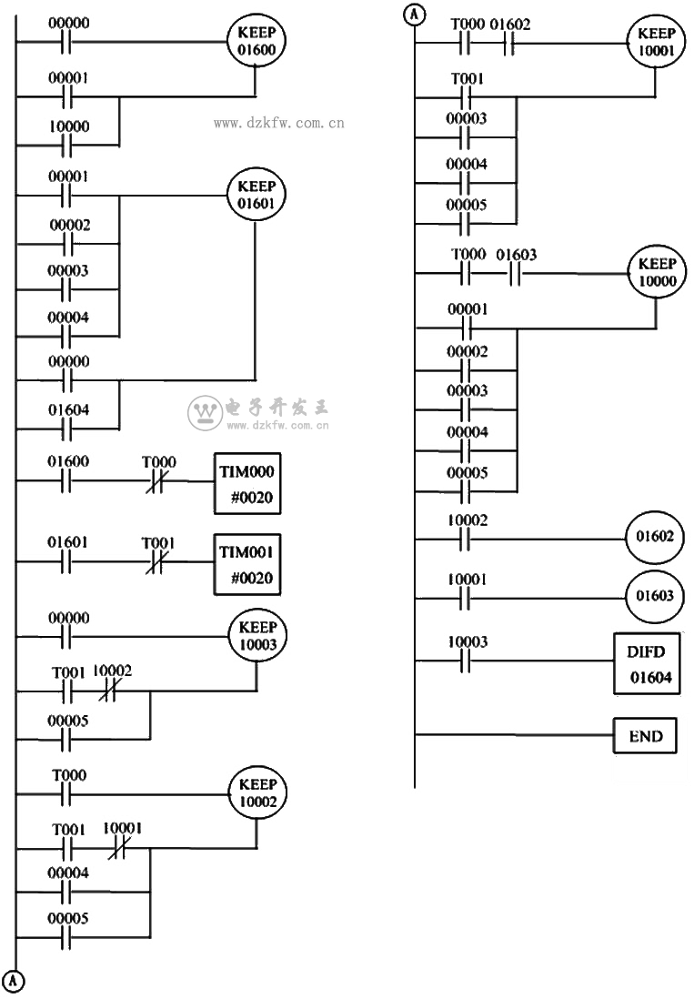 解答:根据要求,每隔2s启动一条皮带,可由脉冲发生器来设定时间间隔。设00000为启动按钮,00001为停止按钮,00002、00003、00004、00005分别为四条皮带的故障停车信号;10000为第1条皮带驱动,10001为第2条皮带驱动,10002为第3条皮带驱动,10003为第4条皮带驱动。中间继电器01602和01603的作用是在启动过程中,连锁接点10002、10001的有效时间滞后1个扫描周期,以保证启动顺序;01604的作用是在4条传送带均停止后,复位停止继电器01601,使系统复原,如图2所示。